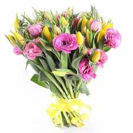 Букет, состоящий из лизиантусов и тюльпанов, красиво играет яркими цветами, придавая композиции непередаваемо свежий вид. Можно подарить «Розовый щербет» друзьям, поднимая настроение и показывая свое теплое отношение. А можно и девушке, демонстрируя свои разнообразные, как и сам букет, но положительные чувства и эмоции.